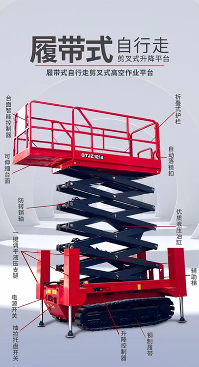 15662431777自行式履帶升降機也可叫做履帶式升降平臺,自走式履帶升降機,履帶式升降機是根據(jù)當(dāng)今市場環(huán)境所造就的一款新型升降機,履帶式升降機區(qū)別于常見的輪式升降機,外形好像履帶式裝甲車,霸氣側(cè)漏,是一款室外復(fù)雜環(huán)境使用的肌肉型升降機